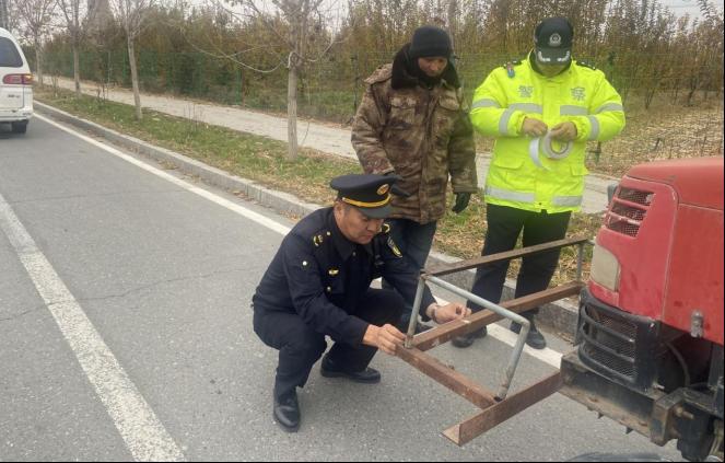 从检查整体情况来看,经过近年来持续开展的农机安全宣传与常态化监管,辖区内农机手的安全意识已显著提升。目前,绝大多数农机车辆均能按规定完成登记备案、按时参加年检并规范粘贴反光标识,农机手持证上岗、规范操作、合规装载的自觉性大幅提高,全县农机安全作业整体态势良好,为秋收工作高效推进奠定了坚实基础。不过,检查中也发现,仍有少部分农户因安全意识不足,在拉运滴灌带时存在超长、超宽装载现象,此类行为极易刮擦对向车辆,严重影响道路行车安全。针对这一问题,执法人员当场进行安全警示教育并指导整改,要求农户就近拆分转运货物,直至车辆符合核定装载标准后方可继续上路。