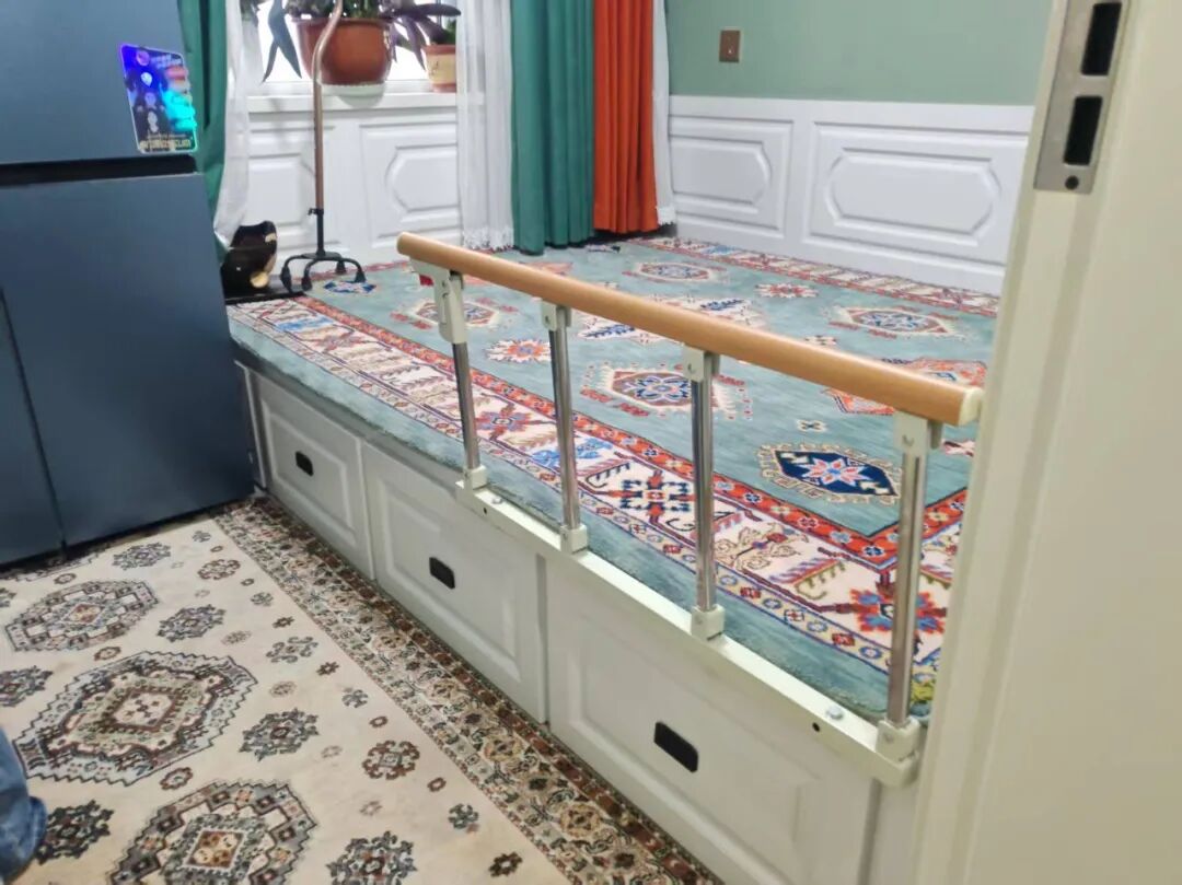 改造内容充分体现了对老年人生活细节的关怀。例如,对行动不便的老年人,配备助浴椅和助行器;将传统的旋转式门把手更换为省力易操作的杠杆式把手,极大方便患有关节炎或手部力量不足的老人开关门;在卫生间、厨房等易湿滑区域铺设专业防滑垫,显著增加地面摩擦力,以降低意外发生概率;对于卫浴空间局促或墙体承重能力有限的家庭,则创新采用卫生间折叠门、无需打孔安装的自立型扶手等新技术与设备,巧妙解决空间与结构限制问题。