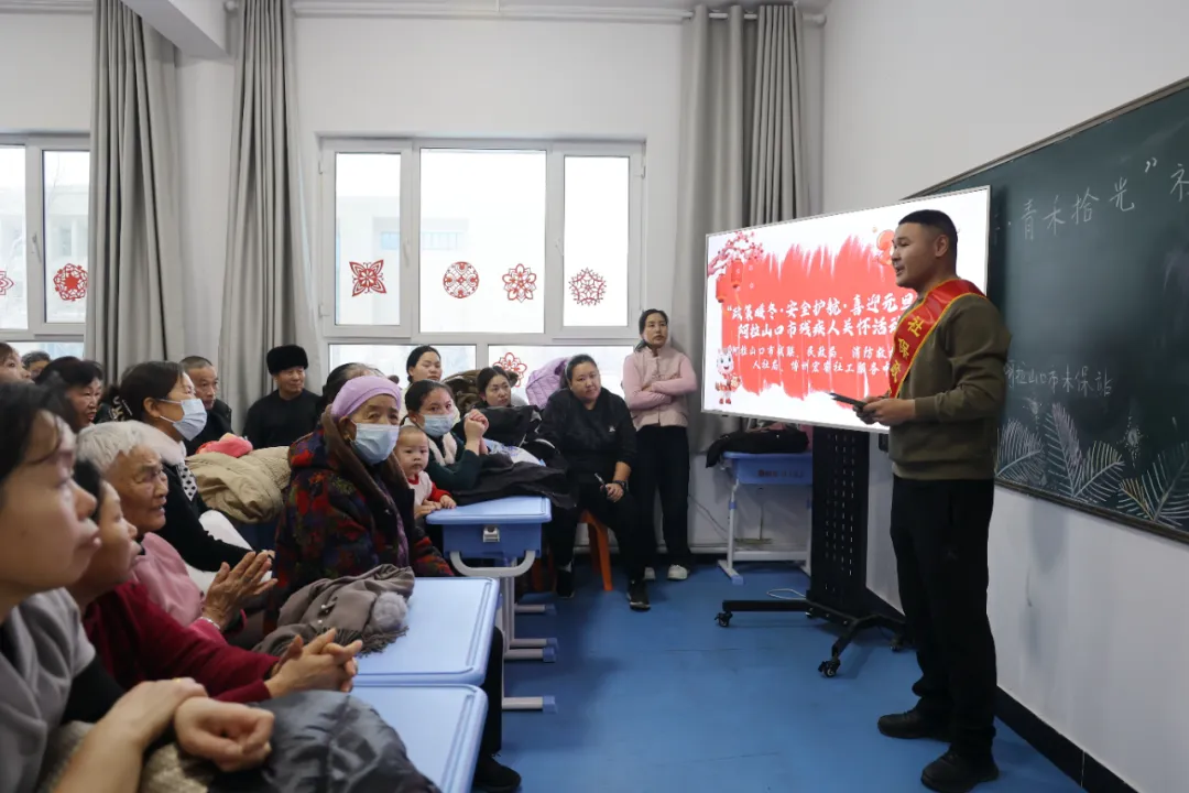 12月24日,阿拉山口市残疾人联合会联合市人力资源和社会保障局、市消防救援大队等多部门在日间照料中心开展以“政策暖冬 安全护航 喜迎元旦”为主题的残疾人关怀服务活动。辖区80余名残疾人及其家属代表参与活动。
