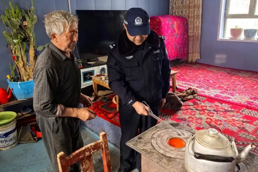 托里镇派出所民警聚焦偏远区域、出租屋、独居老人家庭等重点部位和特殊群体,开展走访检查,细致查看各类取暖设备安装使用情况,排查一氧化碳报警器、烟道等相关安全隐患,并反复叮嘱群众“取暖必通风、睡前查炉具”,以贴心举措守护群众安全。