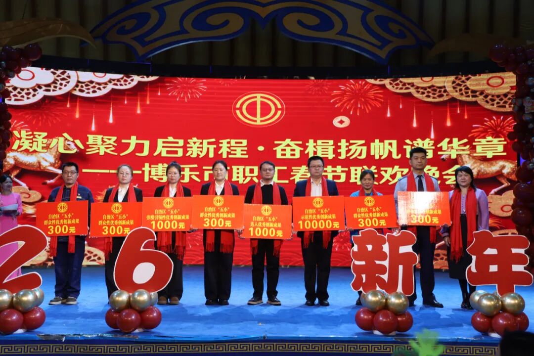 本次晚会融合文艺展演与先进表彰环节,现场分六轮对年度各领域先进典型集中颁奖。白肯·巴合提巴依、帕提古丽等5名自治区劳模及先进工作者率先登台受奖,许兴旺劳模创新工作室、新疆博海水泥有限公司等创新和试点企业,5家自治区女职工休息哺乳室,以及319项自治区“五小”创新成果获奖者依次登台。此外,晚会还为“求学圆梦行动”补助获得者、技能提升奖及“安全隐患随手拍”优秀职工代表颁奖,全面展现新时代博乐职工实干创新的精神风貌。