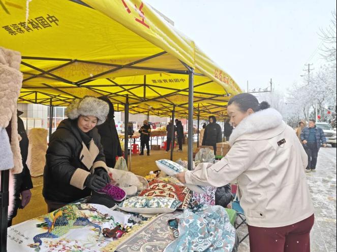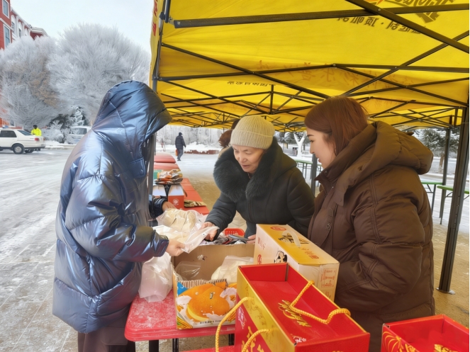 活动现场暖意融融、热闹非凡,以“非遗+年货”模式构建沉浸式消费场景,汇聚了温泉县本地各类非遗商品与特色年货,一站式满足群众新春采购与文化体验需求。在非遗展区,手工刺绣、布艺拖鞋、艾草枕等传统手工艺品做工精湛,图案巧妙融合传统纹样与马年新春元素,针脚间尽显匠心,吸引了众多群众驻足欣赏、咨询选购;美食区则集结了县域优质农牧特色产品,赛湖渔业冷水鱼、安格里格镇西域哈伦水饺、昆得仑牧场木呼尔队鲜驴奶、温泉县贝勒旗尔奶制品等地道美味新鲜供应,让大家在逛展之余,品尝到原汁原味的草原风味。此外,各类冷链产品、休闲零食、新春礼盒一应俱全,全方位覆盖群众采购需求,让浓郁年味在烟火气中愈发醇厚。
