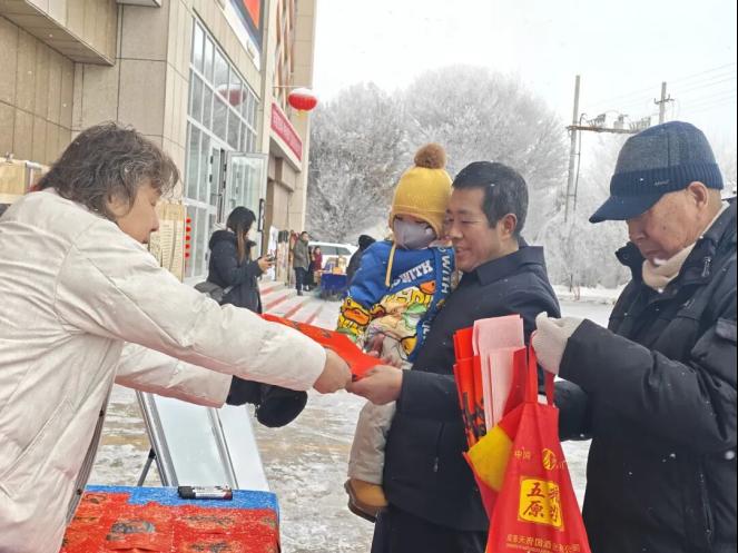 为进一步丰富群众文化体验,活动还特别设置了温泉县岩画展览,通过复刻展板展示与工作人员互动讲解相结合的方式,生动展现温泉县历史悠久的游牧文化与艺术传承,让群众在参观中触摸文化根脉、感受历史底蕴。同时,县美术馆邀请多名书法家现场挥毫泼墨,免费为群众书写春联、福字,一副副笔力遒劲、寓意吉祥的红纸黑字对联,承载着新春的美好祝福,成为现场最热门的打卡点,群众争相领取,将浓浓的年味与暖意带回家中。