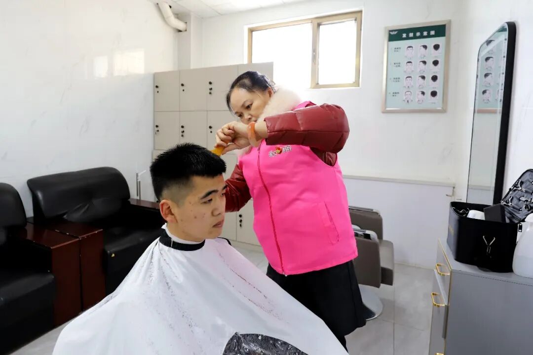 “爱心妈妈”团成员耐心细致地为官兵们修剪头发。文亚辉 摄