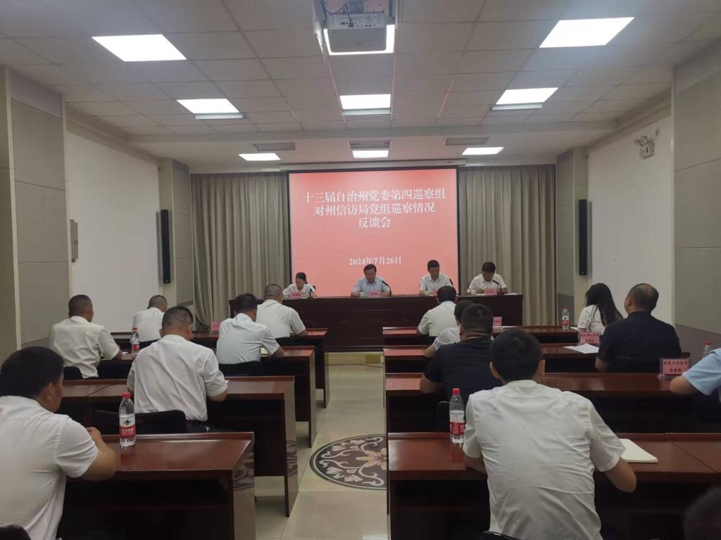 根据州党委统一部署,2024年7月26日上午,十三届自治州党委第四巡察组巡察州信访局反馈会召开。州党委第四巡察组组长宋新莹同志向州信访局党组反馈了巡察情况。州党委巡察工作领导小组成员、州纪委副书记、监委副主任王宇然同志传达了自治州党委书记专题会精神并就抓好巡察整改工作提出了具体要求。州党委副书记、政法委书记谢居友同志出席会议就督促做好巡察整改工作作讲话。州信访局党组副书记、局长白立人同志作表态发言。