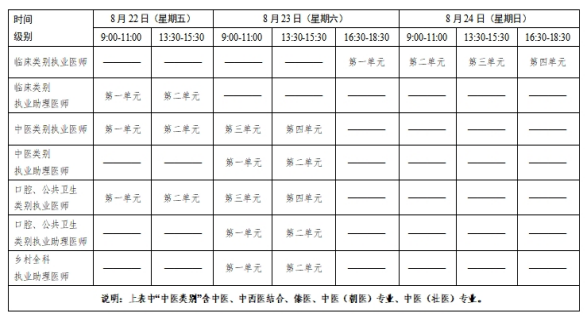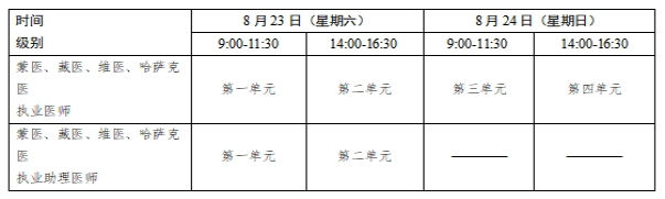 考试实行计算机化考试,军队现役人员加试军事医学、院前急救岗位和儿科专业加试相应内容。中医类别蒙医、藏医、维医、哈萨克医专业实行纸笔考试。统一考试时间如下: