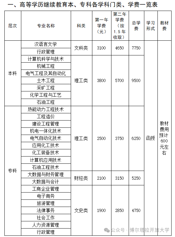 开放教育各专业学费、考试费、注册建档费等费用一览表