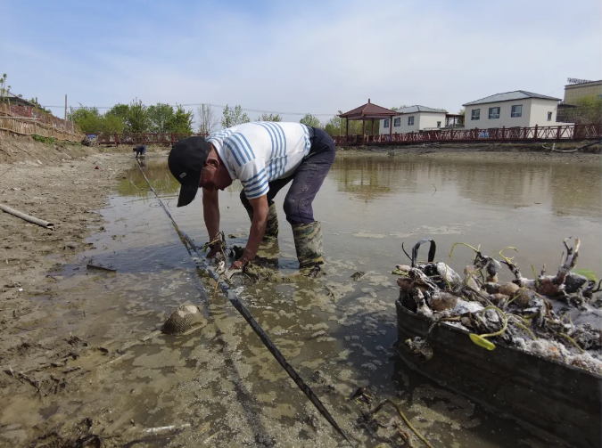 在决肯村荷花池边,工人师傅正在下种。这些刚刚打开的藕种,都已经发芽了,现在正是播种的好时机。这些藕种由武汉农科院精心挑选,他们依据新疆独特的气候特征,从众多品种中筛选出6个适宜品种,共计33件1650斤,并将其运送至新疆。