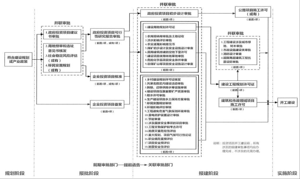 ㈡最快速度并联审批。凡法定未设置前置条件的审批事项全部实行并联审批(见附件1),房屋建筑和市政基础设施工程在工程建设项目审批管理系统上并联办理;有法定前置的审批事项最大限度实现同步受理、并联审查,各审批部门要提前介入、主动服务、快速办结、提高效率。在项目报批阶段,项目建议书、用地预审与选址意见书、社会稳定风险评估、移民安置规划等审批事项实行并联办理。在项目报建阶段,用地审批、环境影响评价、林地草地审核、水土保持方案、节能审查、消防设计审查、施工图审查、地震安全性评价、安全预评价等审批事项实行并联办理。