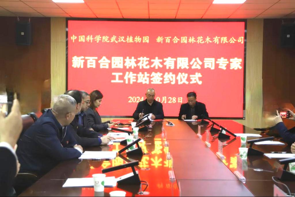 韩月彭代表中国科学院武汉植物园与博乐市新百合园林花木有限公司董事长邱新国签订了合作协议。自治州科技局党组书记、副局长张建,博尔塔拉职业技术学院党委书记周学伟,中国科学院武汉植物园研究员韩月彭以及博乐市新百合园林花木有限公司董事长邱新国共同为专家工作站揭牌。