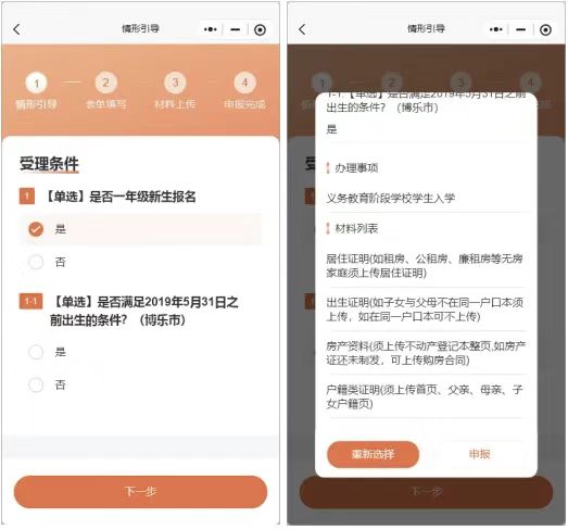是否幼升小选择是,点击下一步,查看办理的事项和所需材料后点击申报。