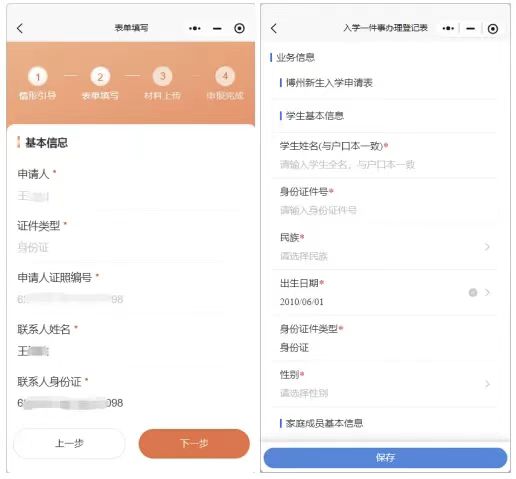 确认基本信息并按步骤填写入学相关字段信息,确认无误后点击保存