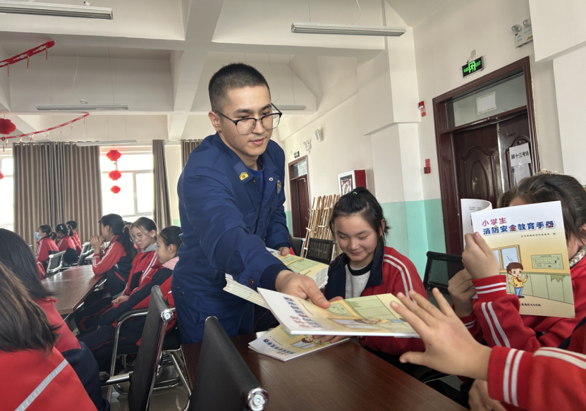 精河县八家户农场小学消防员在给学生们赠送《消防知识安全手册》