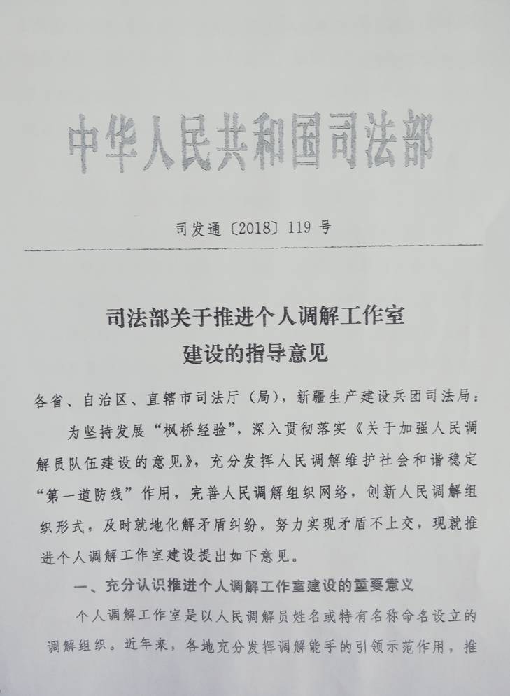现将自治区司法厅《关于转发司法部〈关于推进个人调解工作室建设的指导意见〉的通知》(司发通〔2018〕119号)转发你们,并就有关事宜通知如下: