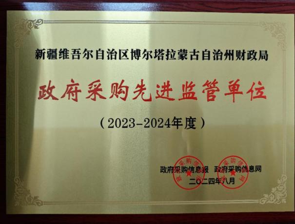 近日,在财政部指定政府采购宣传媒体政府采购信息报联合政府采购信息网举办的第19届全国政府采购监管大会上,博州财政局荣获“2023-2024年度政府采购先进监管单位”荣誉称号,赵国庆同志被授予“2023-2024年度政府采购监管业务标兵”。
