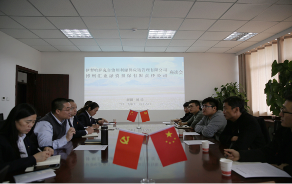 2019年11月18日下午,伊犁利融供应链管理有限公司(以下简称伊犁利融公司)董事长马力克、总经理王旭一行7人来博州担保公司,围绕“供应链+担保”模式进行座谈交流。公司董事长欧世龙、副总经理臧立英参加座谈会。