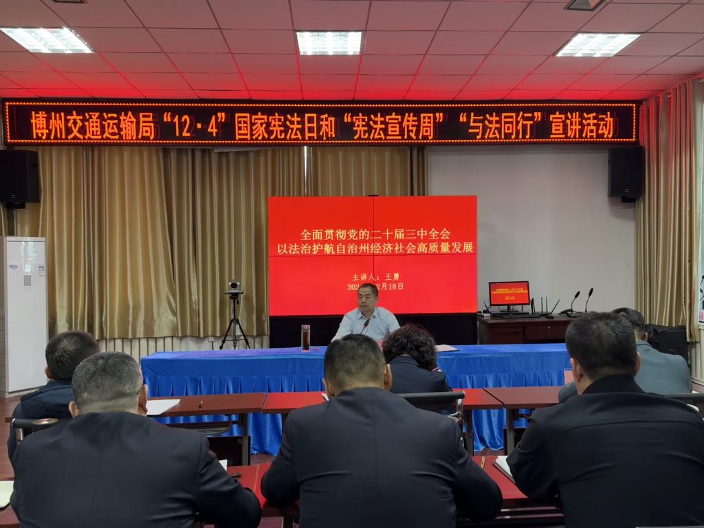 为深入学习贯彻习近平法治思想,进一步推动全面深化改革,培养干部职工牢固树立宪法意识、国家意识、规则意识,增强全体党员干部“尊崇宪法、学习宪法、遵守宪法、维护宪法、运用宪法”的法治意识,12月18日,自治州交通运输局组织开展“12·4”国家宪法日和“宪法宣传周”“与法同行”宣讲活动。州交通运输局党组书记、副局长王勇以“全面贯彻党的二十届三中全会精神 以法治护航自治州经济社会高质量发展”为主题作专题宣讲。