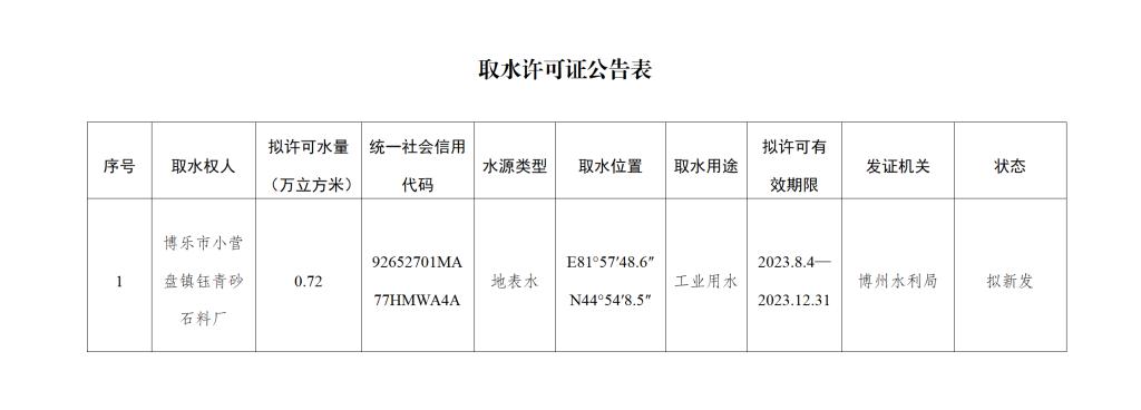 博乐市小营盘镇钰青砂石料厂于2023年7月19日向自治州水利局提交了《博乐市小营盘镇钰青砂石料厂项目取水工程验收申请表(试行)》,根据《取水许可和水资源费征收管理条例》《新疆维吾尔自治区取水许可管理办法》等相关规定,现对该取水项目取水许可进行公告(附件)。若对取水许可有异议的,可在公告之日起五日内以书面形式向自治州水利局提出意见。