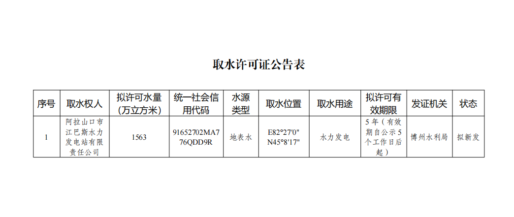 阿拉山口市江巴斯水力发电站有限责任公司于2023年8月14日向自治州水利局提交了《阿拉山口供水管道四级消能电站建设项目取水工程(设施)验收申请表(实行)》,根据《取水许可和水资源费征收管理条例》《新疆维吾尔自治区取水许可管理办法》等相关规定,现对该取水项目取水许可进行公示(见附图)。若对取水许可有异议的,可在公告之日起五个工作日内以书面形式向自治州水利局提出意见。