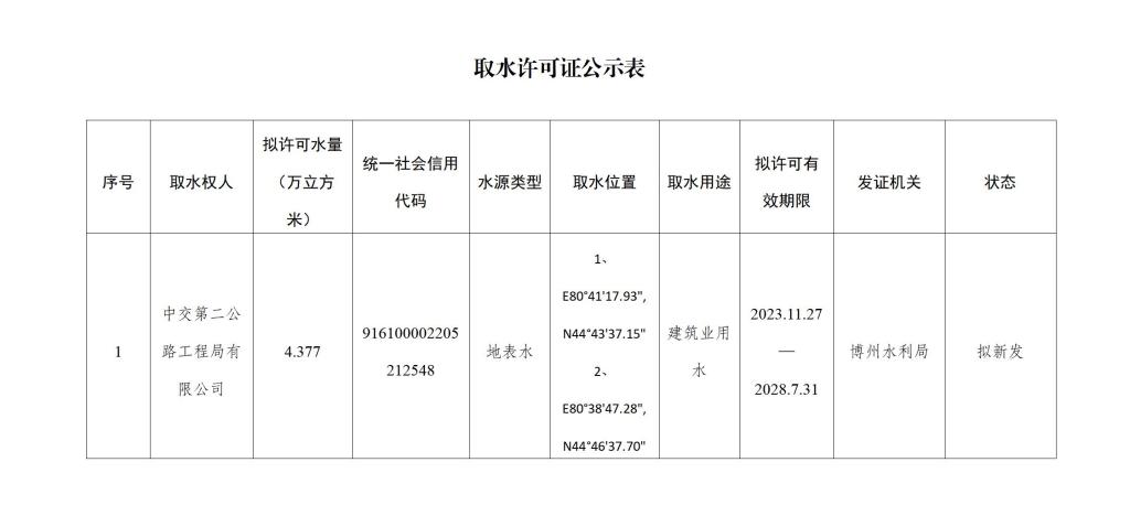 中交第二公路工程局有限公司于2023年11月7日向自治州水利局提交了《中交第二公路工程局有限公司G219线温泉—霍尔果斯公路建设项目第WHSJ-3标段取水工程(设施)验收申请表(试行)》,根据《取水许可和水资源费征收管理条例》《新疆维吾尔自治区取水许可管理办法》等相关规定,现对该取水项目取水许可进行公示(见附件)。若对取水许可有异议的,可在公告之日起五个工作日内以书面形式向自治州水利局提出意见。