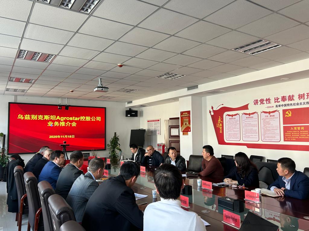11月18日,中国国际商会博尔塔拉商会牵头,在博举办乌兹别克斯坦Agrostar控股集团(乌兹别克斯坦国有重点企业,(Uzagrostar控股)由乌兹别克斯坦国总统提议成立,在乌兹别克斯坦16个地区设分公司、覆盖54个下属县,核心业务涵盖农产品种植、加工、销售全链条)业务推介暨企业对接会,博州参会企业有山东寿光博乐分公司、博乐聚淼环保科技、勃罗农机、兴晟塑业等十家企业,乌方参会人员有Agrostar控股集团副总、其他分公司负责人以及集团研发团队专家等,首先Agrostar控股负责人进行推介,然后博州企业介绍主要业务,最后两国企业就共同关注的问题进行深入交流。