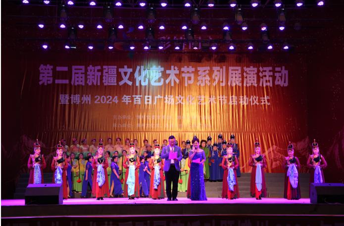 2024年4月28日晚,由博州党委宣传部、博州文体广旅局主办,博州文化馆和各县(市)文体广旅局承办的“七彩铸同心”第二届新疆文化艺术节系列展演活动暨博州2024年百日广场文化艺术节启动仪式在博乐市西部文化广场举行。