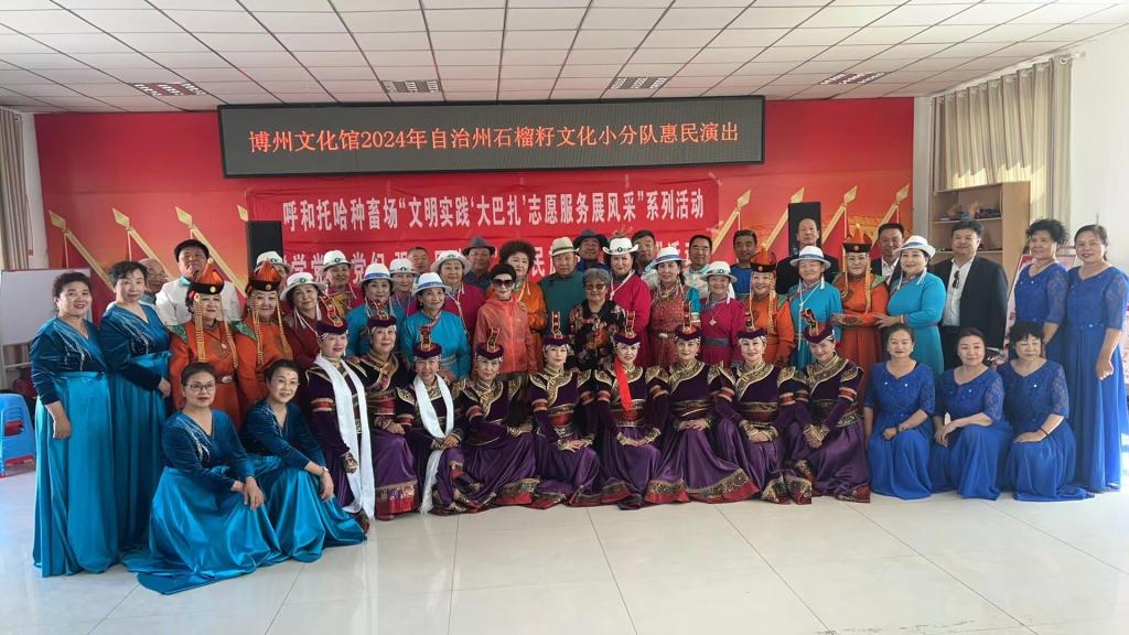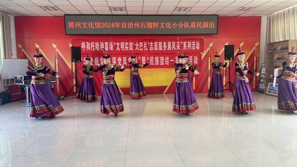 为传承和弘扬中华优秀传统文化,丰富群众文化生活,弘扬文明新风,2024年5月8日,博州文化馆“石榴籽”文艺小分队赴温泉县呼和托哈种畜场集贸市场和布很依肯队,开展“我们的中国梦·文化进万家”惠民宣讲演出系列活动。