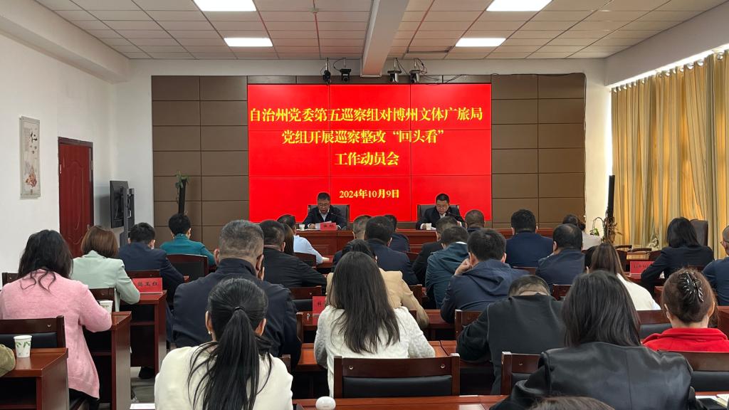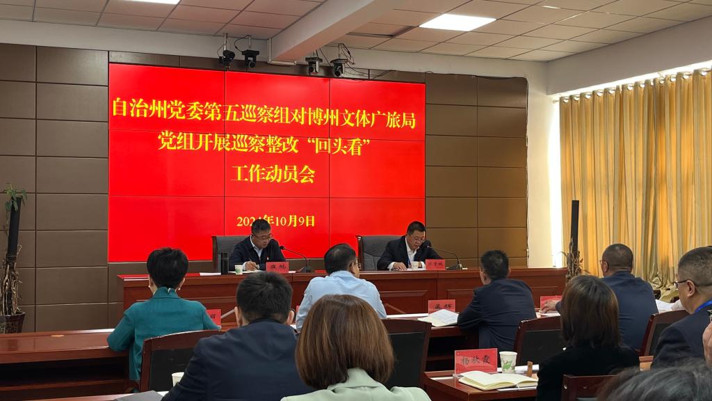 根据自治州党委关于巡察工作的统一部署,10月9日,自治州党委第五巡察组对州文体广旅局党组开展巡察整改“回头看”工作动员会议召开。会前,自治州党委第五巡察组副组长阮子城主持召开与州文体广旅局党组主要负责人和班子成员的见面沟通会,传达了自治州党委书记专题会议精神,通报了本次巡察整改“回头看”的有关工作任务和相关要求。会上,自治州党委第五巡察组副组长阮子城作了动员讲话,并对做好巡察整改“回头看”工作提出了明确要求。州文体广旅局党组书记崔魁主持会议并作表态发言。
