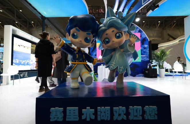 此次冬博会现场,设立了博州独立特装展区,展厅以“游博州 知新疆”为主题,主色调为赛湖蓝和哈达白相结合,象征着博州冬季的纯净和吉祥繁荣的寓意。展厅里遍布赛里木湖冰眼、冰泡、雪花、天鹅等元素,融入了“蓝泡泡”“冰花花”冬季IP形象。展厅设置主屏幕区、博州礼物展示区及各县市、赛里木湖景区形象展示区,通过视频播放、灯箱滚动循环展示博州各地文旅资源。展厅顶部设置两盏投影灯,向地面投射雪花光影,渲染冬季冰雪氛围。