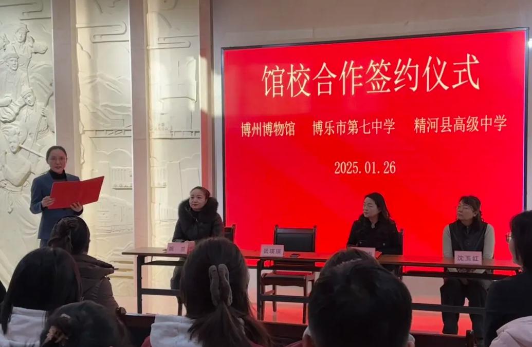 为贯彻落实习近平总书记关于文物保护的重要指示精神,进一步铸牢中华民族共同体意识,充分发挥博物馆的社会教育职能,促进博物馆资源与学校教学、综合实践有机结合,实现馆校合作的双向赋能。2025年1月26日上午,博州博物馆与博乐市第七中学、精河县高级中学在博州博物馆举行馆校合作签约仪式,正式开启双方在教育领域的深度合作,携手共筑教育发展新篇章。