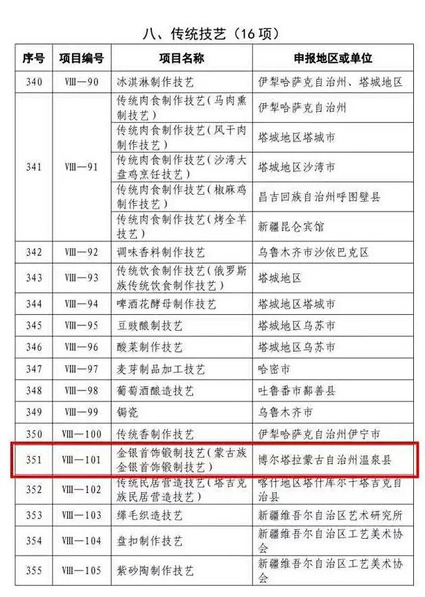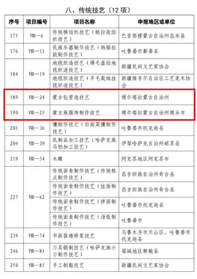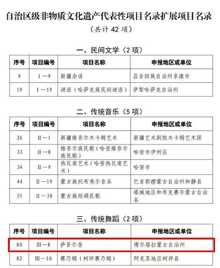 此次公布的名录共包含91项非遗代表性项目,其中包括新增项目49项,扩展项目42项,涵盖民间文学、传统音乐、传统舞蹈、传统戏剧、曲艺、传统体育游艺与杂技、传统美术、传统技艺、传统医药、民俗等多个领域进一步丰富了自治区非物质文化遗产的保护谱系。其中博州有4项入选。
