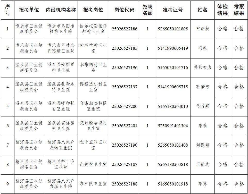根据《新疆维吾尔自治区2025年下半年面向社会公开招聘事业单位工作人员分类考试公告》及大学生乡村医生专项计划有关规定,经过笔试、资格审查、面试、体检、考察等程序,现将博尔塔拉蒙古自治州2025年下半年面向社会公开招聘事业单位工作人员乡村医生岗位拟聘用人员予以公示(附表)。公示时间为7个工作日,即2026年1月8日至1月16日。