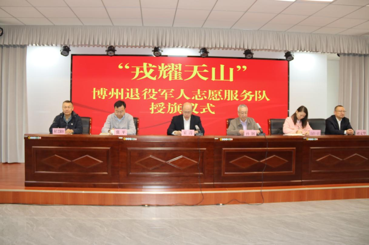 为号召和动员广大退役军人充分发扬“特别能吃苦、特别能战斗、特别能奉献”的优良作风,弘扬军人无私奉献精神,积极投身志愿服务,彰显博州退役军人的时代风采,4月16日,博州举行“戎耀天山”退役军人志愿服务队授旗仪式。州人民政府副州长宋涛同志出席仪式并致辞,州退役军人事务局局长孙钢同志主持仪式。州党委宣传部、州团委、州民政局分管领导,自治州退役军人事务局领导班子成员和机关及直属事业单位全体干部职工,“戎耀天山”博州退役军人志愿服务队全体成员、各县(市)退役军人志愿服务队队员代表约50余人参加仪式。