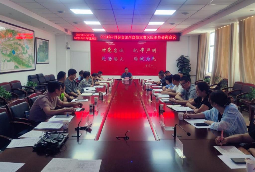为认真贯彻落实自治州党委、政府重点工作部署,切实防范化解重大安全风险,近期,自治州减灾委办公室组织召开了多部门联合会商会议,对自治州2024年7月份自然灾害风险类型、风险等级和高风险区域开展了综合分析研判,州气象局、水利局、林业和草原局、农业农村局、自然资源局、博乐地震监测中心站以及各县市减灾委员会办公室等18个部门单位和有关领域专家参加了此次会议。