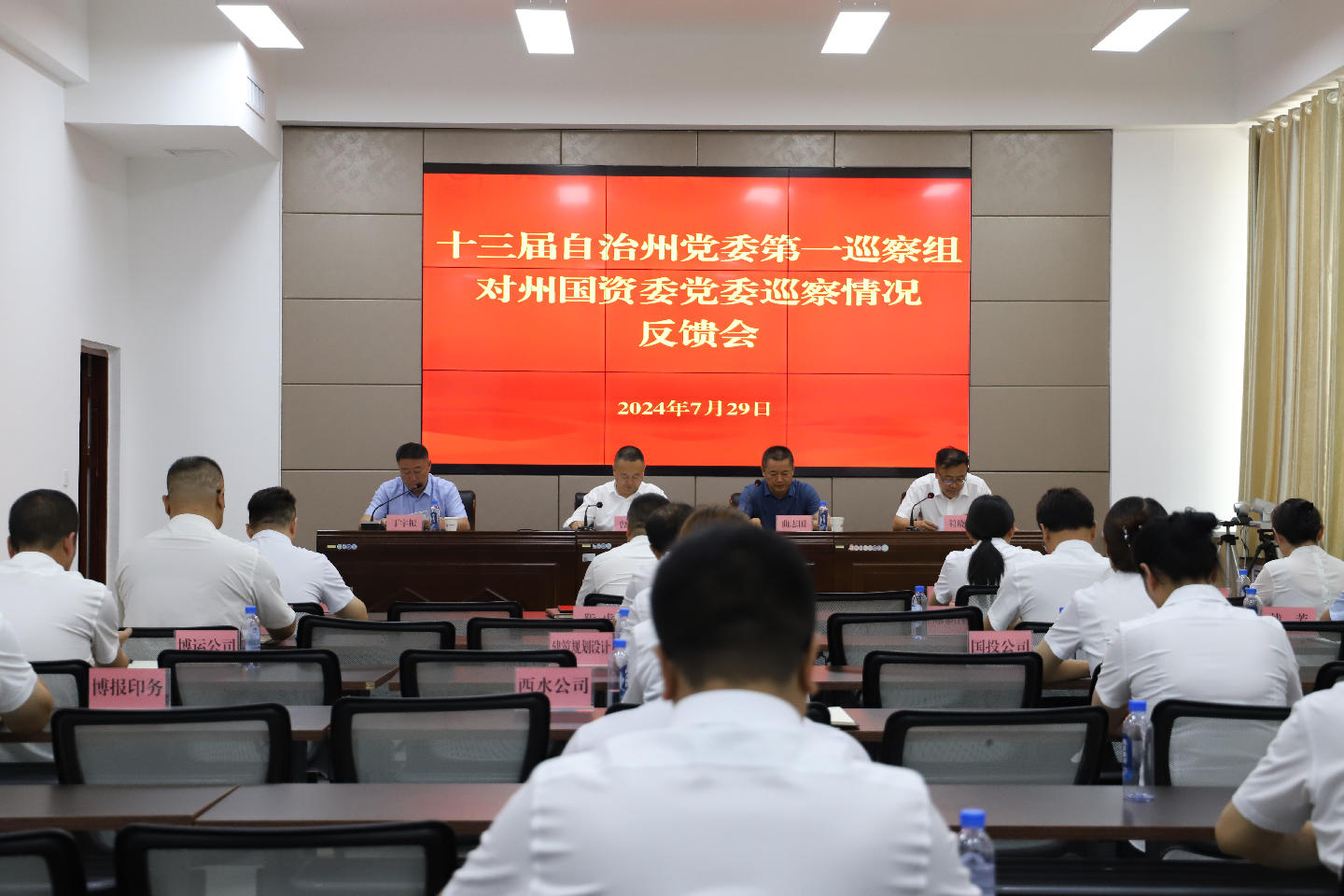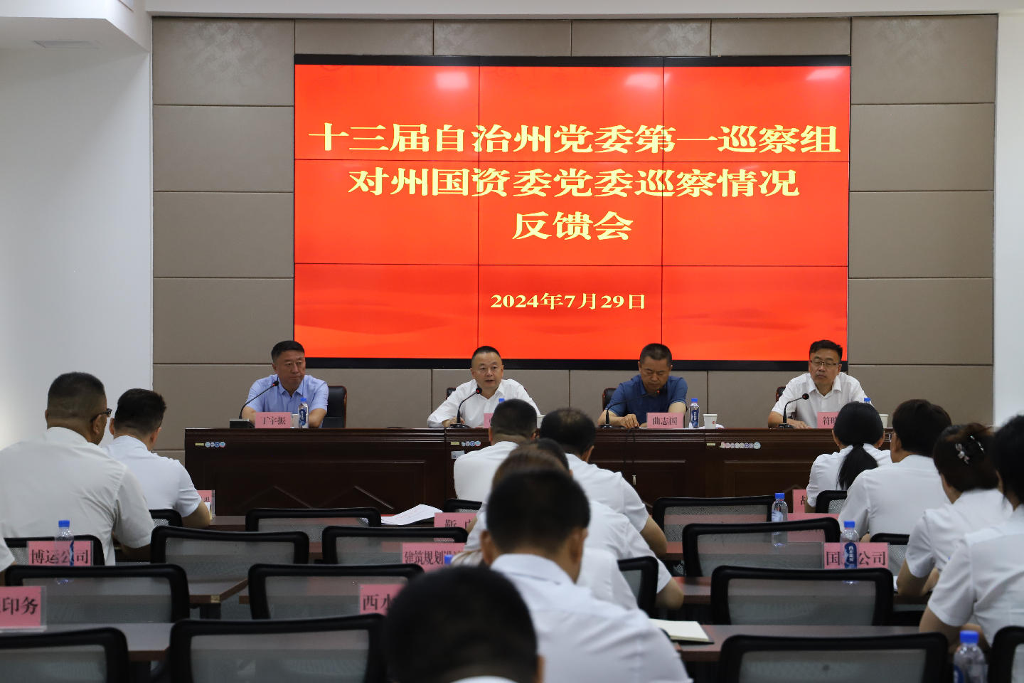 根据州党委部署,2024年7月29日,十三届自治州党委第一巡察组向州国资委党委反馈巡察情况。自治州党委常委、常务副州长曾健,自治州纪委常委、党委巡察办主任曲志国参加向州国资委党委反馈会议,对抓好巡察工作提出要求。自治州党委第一巡察组组长丁宇振分别向州国资委党委书记、副主任符晓军和领导班子反馈了巡察情况。符晓军主持会议并就做好巡察整改工作作表态。