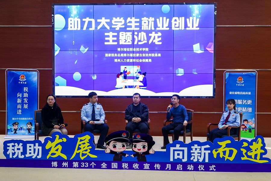 今年全国税收宣传月的主题为“税助发展 向新而进”。青年是最富活力和创新的群体,是推动新质生产力形成的主体性力量。博州税务局党委委员、副局长马涛在活动致辞中表示,税务部门、人社部门以及学校招生就业处联合开展就业创业政策宣讲活动,旨在希望通过部门间的信息共享、协作配合,为广大毕业生就业创业提供全方位、一揽子的支持和帮助。