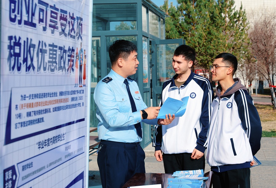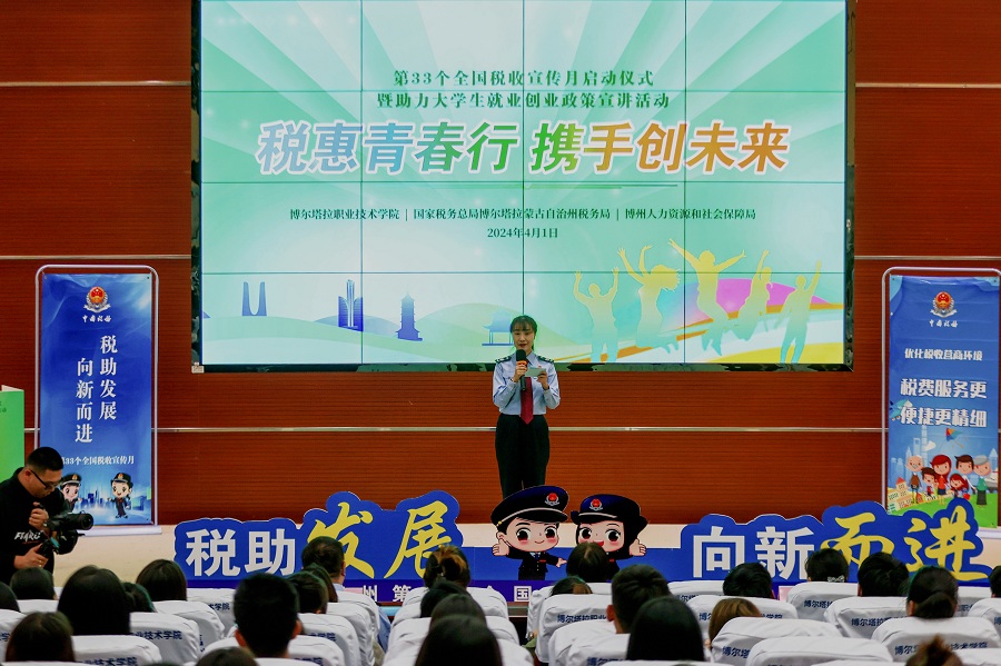 4月1日,博州第33个全国税收宣传月启动仪式暨“税惠青春行 携手创未来”助力大学生就业创业政策宣讲活动在博尔塔拉职业技术学院举行。活动以就业创业政策宣讲、创业园政策辅导和青年创客经验分享等形式,助力广大毕业生走稳创业就业路。