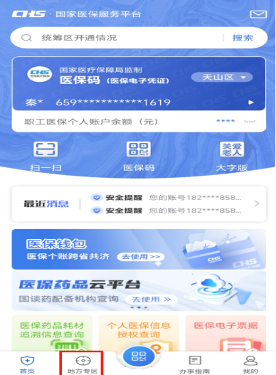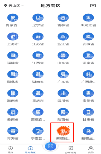 登录国家医保APP后,进入最下方“地方专区”,点击“新疆维吾尔自治区”进行使用。