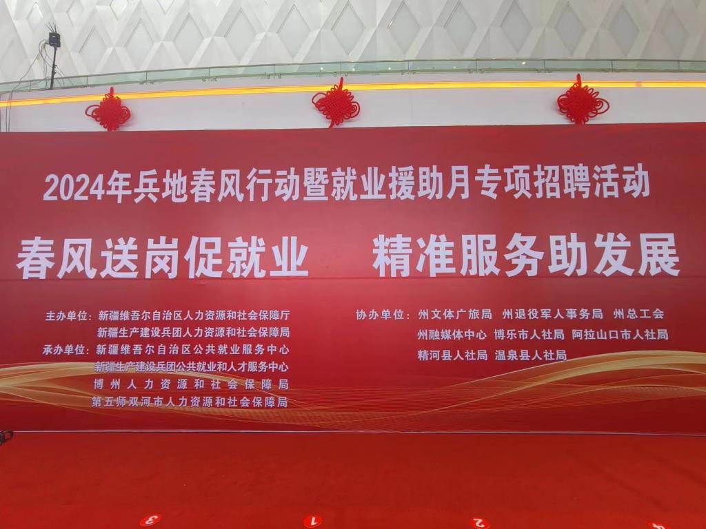 根据自治区人社厅《关于开展2024年兵地春风行动暨就业援助月通知》要求,更好地为用人单位和退役军人提供安全、便捷、高效的双向选择信息服务,博州退役军人事务局积极联合州人力资源和社会保障局于2024年1月25日,在博州文化体育艺术中心全面启动了以“春风送岗促就业精准服务助发展”为主题的线上线下系列就业招聘活动。