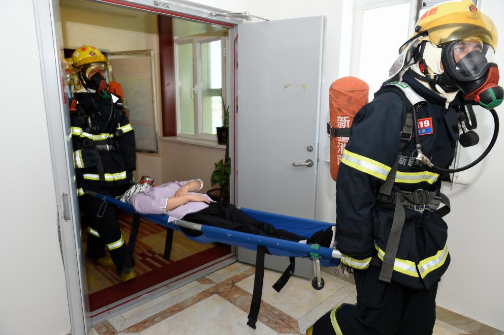 16时30分,演练正式开始,演练设置酒店七楼一房间着火,现场火势迅猛,室内充满有毒烟气,有两名人员被困。发生火灾后,单位工作人员立即向119消防指挥中心报警,同时组织本单位微型消防站人员利用内部消防设施进行自救,及时疏散现场人员。指挥中心迅速调集相关力量赶赴现场,当日全勤指挥部遂行出动。消防救援队伍到场后立即成立了火情侦察组、救援组、灭火组、破拆组、警戒组、供水组、安全员等,明确了任务和分工,开展救援行动。演练过程中,火情侦查组先后进行外部侦查、内部侦查、询问知情人、利用消防控制室等方式进行情况了解;救援组在水枪掩护下通过热成像仪、呼喊、破拆等方式对两名被困人员进行施救;灭火组利用垂直铺设水带和沿楼梯蜿蜒铺设水带在着火层下一层建立两个水枪阵地;供水组利用地下消火栓保证供水不间断。经过指战员的奋力扑救和全力搜救,两名被困人员全部救出,最终火势全部扑灭,全面检验了指战员面临火情的处置能力和协同配合能力。