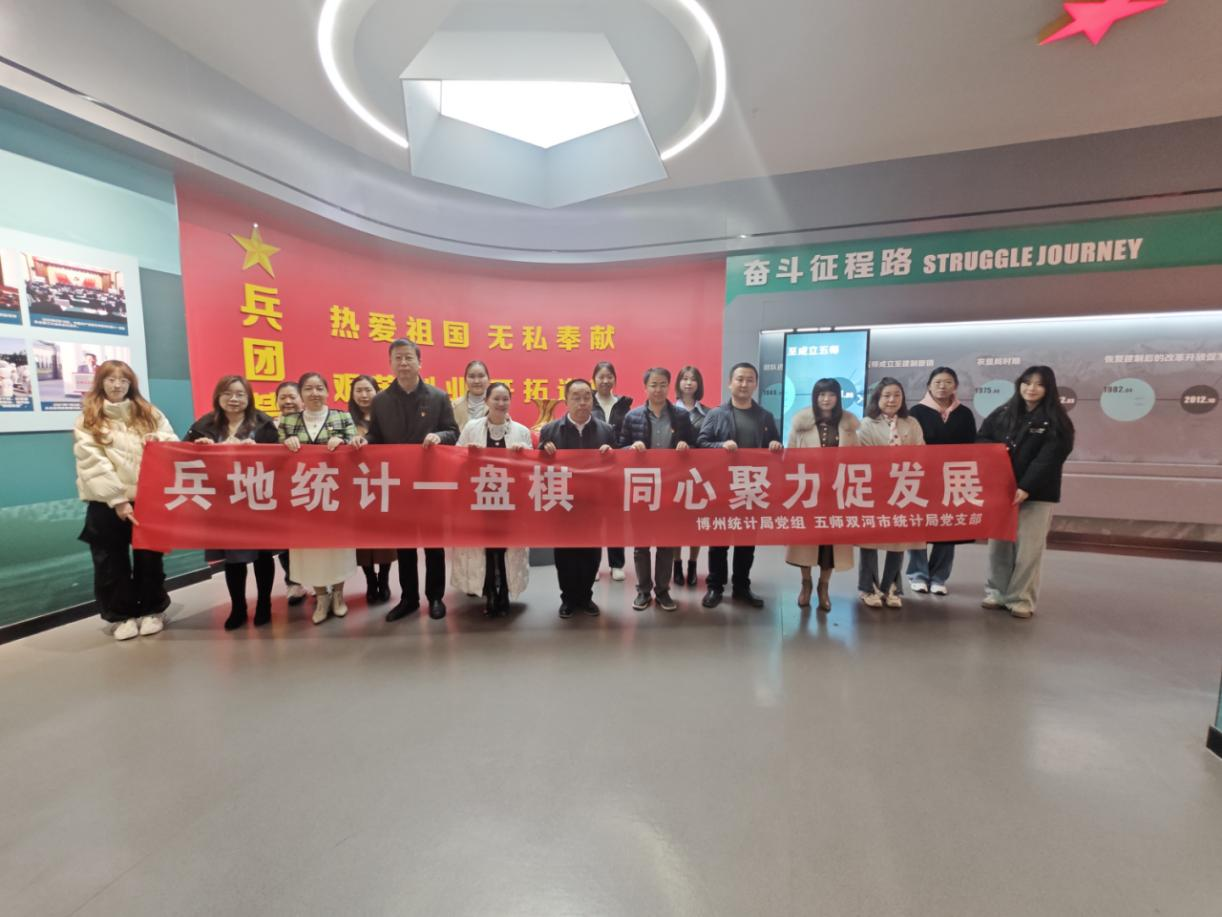 博州统计局、双河市统计局联合开展“兵地统计一盘棋同心聚力促发展”主题党日活动。全体人员共同参观兵团第五师双河市城市陈列馆,通过观看历史影像、军垦文物及数字化展陈,系统了解兵团第五师从屯垦戍边到建城戍边的奋斗历程,特别是通过展示兵团第五师建师初期与新时代城市发展的新旧对比图集,深切感受“热爱祖国、无私奉献、艰苦创业、开拓进取”的兵团精神在统计工作中的现实意义。