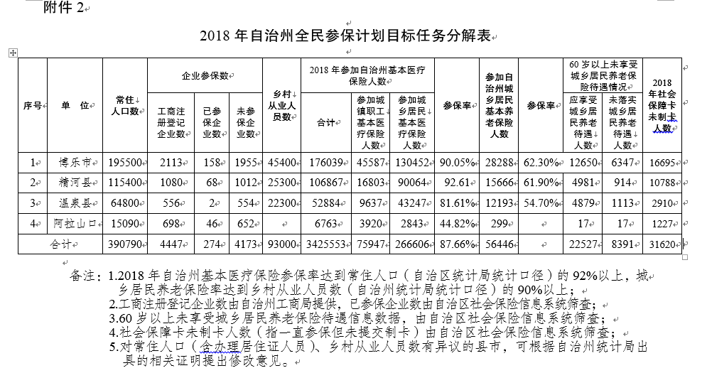 为进一步推进自治州全面实施全民参保计划,形成政府主导、部门协作、上下联动、全民参与的工作格局,尽快实现覆盖全民、人人享有基本社会保障的目标,根据自治区《关于全面实施全民参保计划的通知》(新政办发〔2018〕55号)要求,结合博州实际,制定本工作方案。
