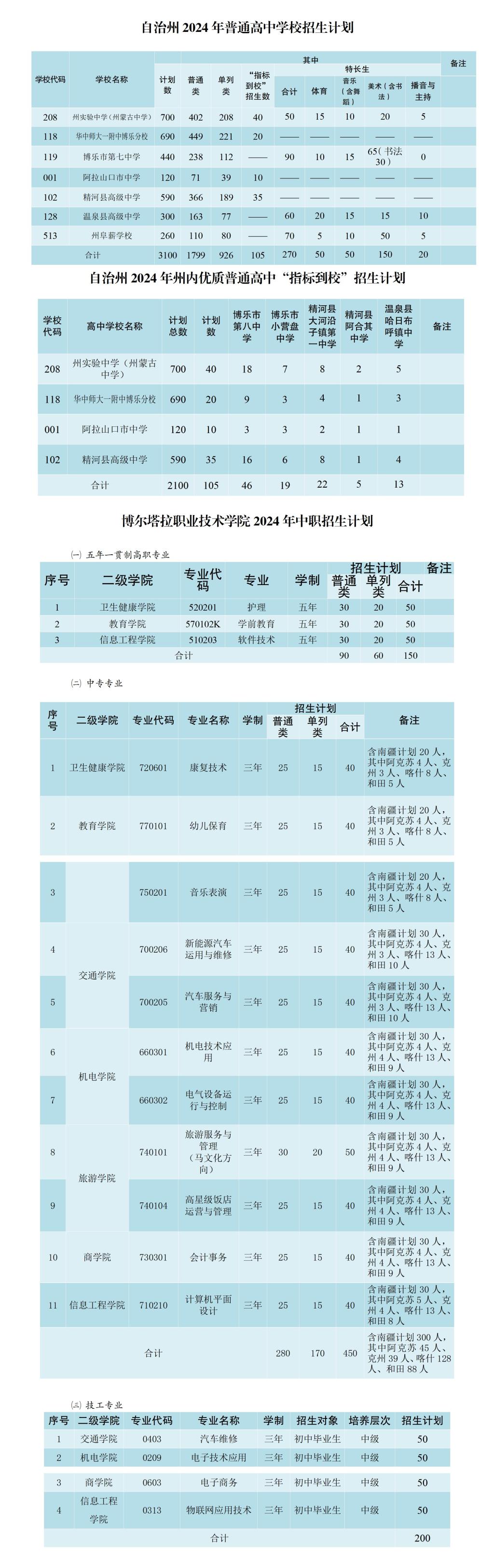 1.计划分类:①中等职业教育招生计划700个,其中南疆专项计划300个(阿克苏45个、克州39个、喀什128个、和田88个)、联合办学计划100个(博尔塔拉职业技术学院与伊犁中等职业技术学校联合办学,前三年在伊犁中等职业技术学校就读中职、后两年在博尔塔拉职业技术学院就读高职)。②技工专业计划200个。