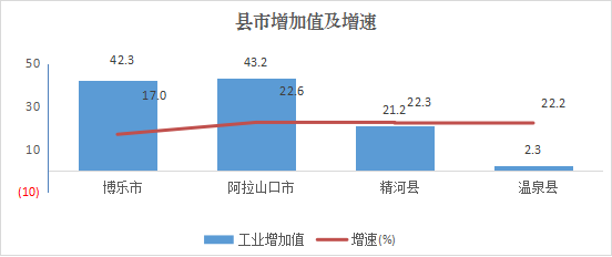 县市工业全部增长。各县市工业生产保持增长态势,博乐市实现工业增加值4.23亿元、增长17.0%;阿拉山口市实现工业增加值4.32亿元、增长22.6%;精河县实现工业增加值2.12亿元、增长22.3%;温泉县实现工业增加值0.23亿元、增长22.2%。