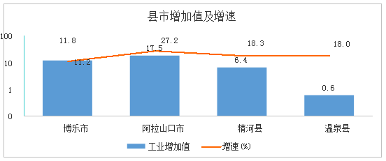 县市工业全部实现增长。各县市工业生产保持增长态势,阿拉山口市实现工业增加值17.47亿元、增长27.2%;精河县实现工业增加值6.36亿元、增长18.3%;温泉县实现工业增加值0.58亿元、增长18%;博乐市实现工业增加值11.79亿元、增长11.2%;