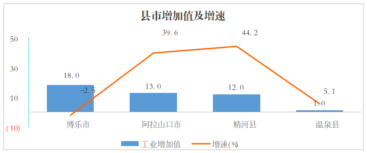 县市工业三增一降。各县市工业生产保持增长态势,博乐市实现工业增加值1.84亿元、下降2.5%;阿拉山口市实现工业增加值1.32亿元、增长39.6%;精河县实现工业增加值1.17亿元、增长44.2%;温泉县实现工业增加值0.1亿元、增长5.1%。