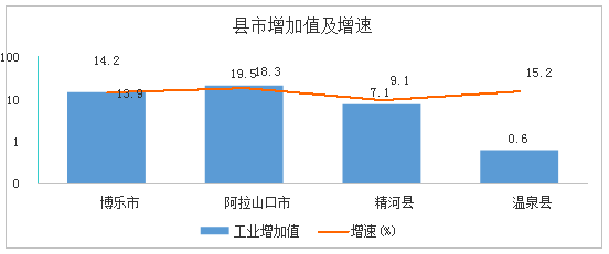 县市工业全部实现增长。各县市工业生产保持增长态势,阿拉山口市实现工业增加值19.52亿元、增长18.3%;温泉县实现工业增加值0.62亿元、增长15.2%;博乐市实现工业增加值14.19亿元、增长13.9%;精河县实现工业增加值7.14亿元、增长9.1%。