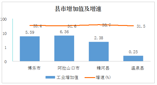 ㈢县市工业全部实现增长。各县市工业生产呈现出高速速增长态势,博乐市实现工业增加值5.59亿元,同比增长33.4%;阿拉山口市6.36亿元、增长31.6%;精河县实现工业增加值2.38亿元、增长38.7%;温泉县实现工业增加值0.25亿元、增长31.5%。