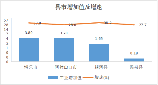 ㈢县市工业全部实现增长。各县市工业生产呈现出快速增长态势,博乐市实现工业增加值3.8亿元,同比增长37%,占全州总量的41%,拉动全州工业增长14.8个百分点;阿拉山口市3.7亿元、增长28%,占全州总量的39.7%,拉动全州工业增长12.4个百分点;精河县实现工业增加值1.65亿元、增长38.2%,占全州总量的17.7%,拉动全州工业增长7.1个百分点;温泉县实现工业增加值0.18亿元、增长27.7%,占全州总量的1.9%,拉动全州工业增长0.6个百分点。
