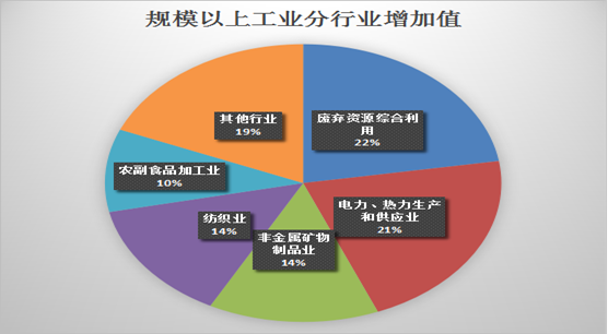 ㈡主要行业实现增长。工业21个行业大类中18个行业增加值实现增长,占全部行业86%。其中,纺织业实现增加值1.3亿元、增长63.4%;废弃资源综合利用业实现增加值2.1亿元、增长48.4%;非金属矿物制品业实现增加值1.3亿元、增长35.6%;农副食品加工业实现增加值0.9亿元、增长30.5%;电力、热力生产和供应业实现增加值2亿元,同比增长5.2%。